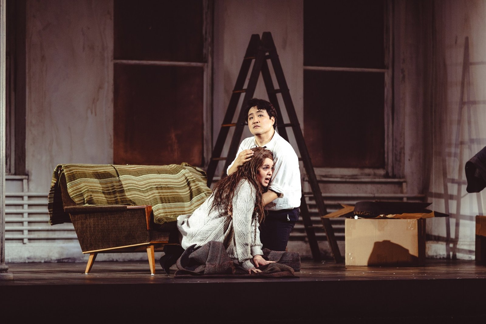 The slender Yana Kleyn of Russian origin, with a soprano that effortlessly catches everything from shy advances at the Boehme’s, over the exuberant wildness of the café, to soprano sighs at the atelier where she gets some warmth on her deathbed.